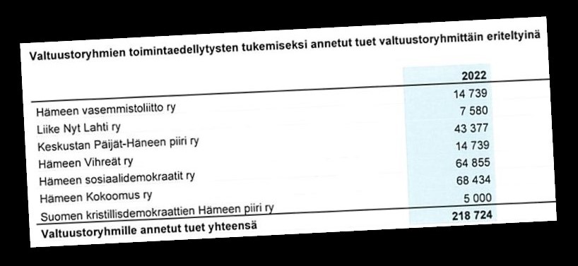 Puolueiden piirijärjestöille maksetut puoluetuet muodostivat liki puolet vuoden 2022 alijäämästä. Tilinpäätöstietojen mukaan puolueiden piirijärjestöt nostivat puoluetukea hyvinvointialueen kassasta seuraavasti: kokoomus 68 434 €, sdp 64 855 €, keskusta 43 377 €, vihreät 14 739 €, vasemmistoliitto 14 739 €, liike nyt 7 580 € ja kristilliset 5 000 €. Selvyyden vuoksi sanottakoon, että valtuustoryhmämme Pro Lahti ei ole vastaanottanut puoluetukea. Puoluetukea nostaneille aluevaltuustoryhmille kävi kuten Kalle Tappiselle kohtalokkaassa sambassa, kun saapui uusi aamu, ne viulut maksoi, kas poissa oli lompakko ja myöskin tyttönen. Valitettavasti viulun maksajiksi joudumme me hyvinvointialueen asukkaat kohtuuttomina asiakasmaksuina, karsittuina palveluina, hoitoviiveenä tai hoidon laiminlyöntinä.