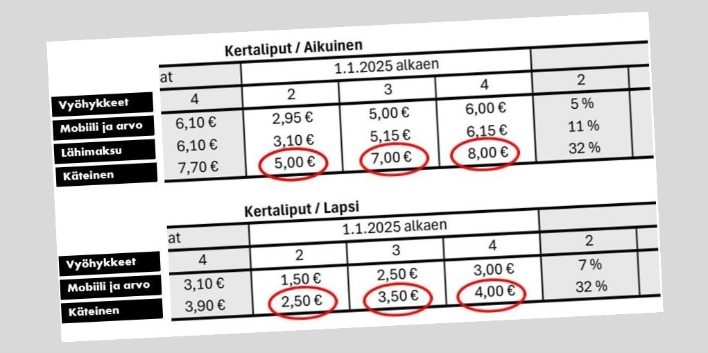 Lautakunta päätti 12.11.2024 lopettaa busseissa käteismaksun vastaanottamisen ja rangaista muutoinkin käteismaksajia roimilla lippuhintojen korotuksilla siten, että käteisellä maksettujen aikuisten kertalipun hinta on noin 2 euroa mobiili- ja arvolippua kalliimpi. Tämä on nähdäkseni osaa matkustajia syrjivää sekä vastoin Euroopan unionin neuvoston asetusta (EY) N:o 974/98 euron käyttöönotosta sekä Euroopan komission suositusta (2010/191/EU).