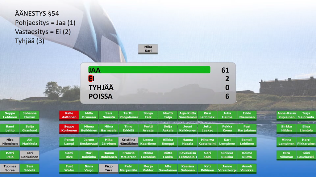 Vaikka esittämäni 6,0 miljoonan euron lisämääräraha on puolen promillen luokkaa yli miljardin euron budjetissa, torjuivat puolueet esityksen yksissä tuumin. Lisämäärärahaesitys kaatui äänestyksessä luvuin 61 – 2 (poissa 6). Ohessa äänestysluettelo: