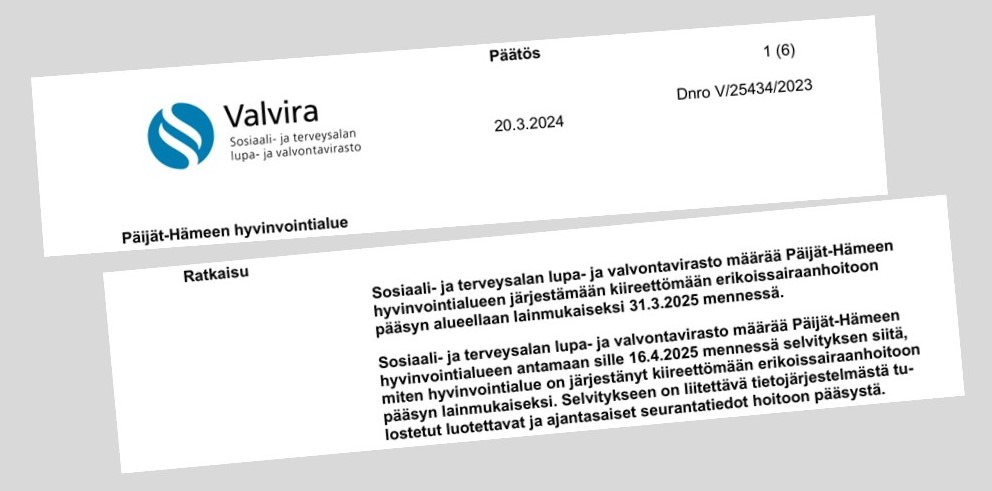 Sosiaali- ja terveysalan lupa- ja valvontavirasto määräsi maaliskuussa Päijät-Hämeen hyvinvointialueen järjestämään kiireettömään erikoissairaanhoitoon pääsyn alueellaan lainmukaiseksi 31.3.2025 mennessä. Se myös määräsi Päijät-Hämeen hyvinvointialueen antamaan sille 16.4.2025 mennessä selvityksen siitä, miten hyvinvointialue on järjestänyt kiireettömään erikoissairaanhoitoon pääsyn lainmukaiseksi.