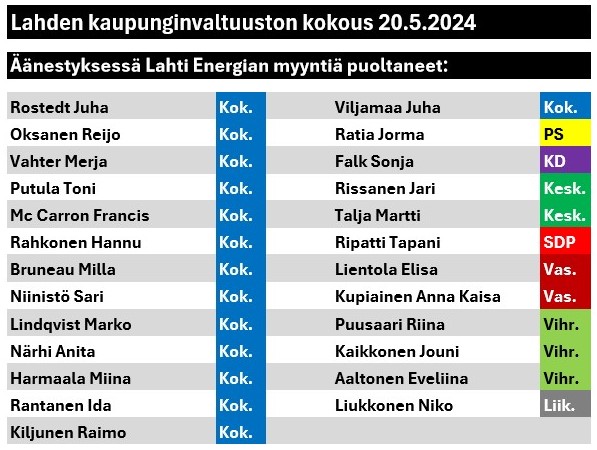Kiitos järkevien lahtelaisten ja Lahti Energian asiakkaiden kaadoimme vii-me keväänä uusimman yrityksen kaapata energiayhtiömme kansainvälisille sijoittajille, tällä kertaa Arberdeenin, Maquariellen ja Allianzin kaltaisille kansainvälisille saalistajille. Myyjät hakevat kuntavaaleissa valtakirjaa myynnille.